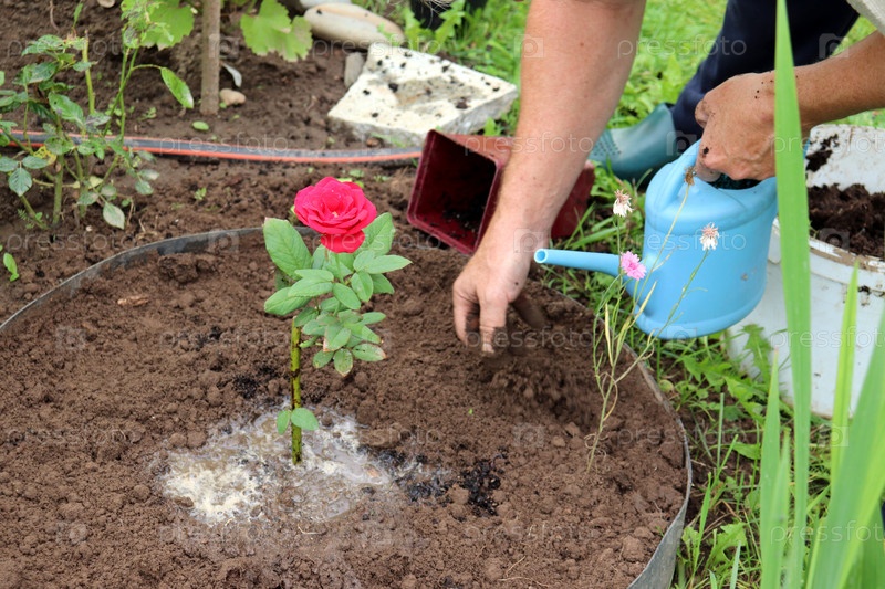 Мужчина пенсионер сажает и поливает красную розу на клумбе - руки с лейкой