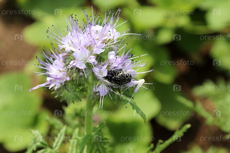 Спаривание черных жуков бронзовок на цветах фацелии на лугу