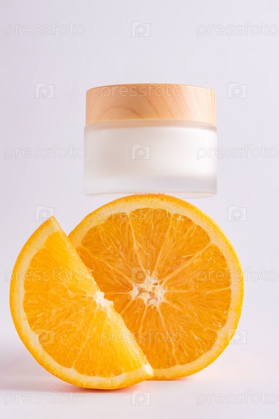 Косметическая баночка с натуральным энергетическим витамином С для ухода за кожей. Косметический крем с кусочками апельсина на белом фоне