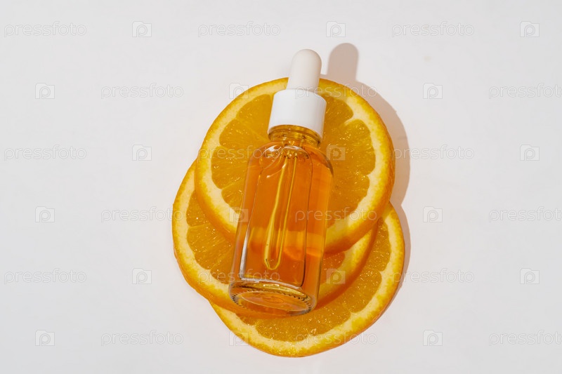 Экстракт сыворотки витамина С с нарезанным апельсином, вид сверху. Натуральная косметика по уходу за кожей