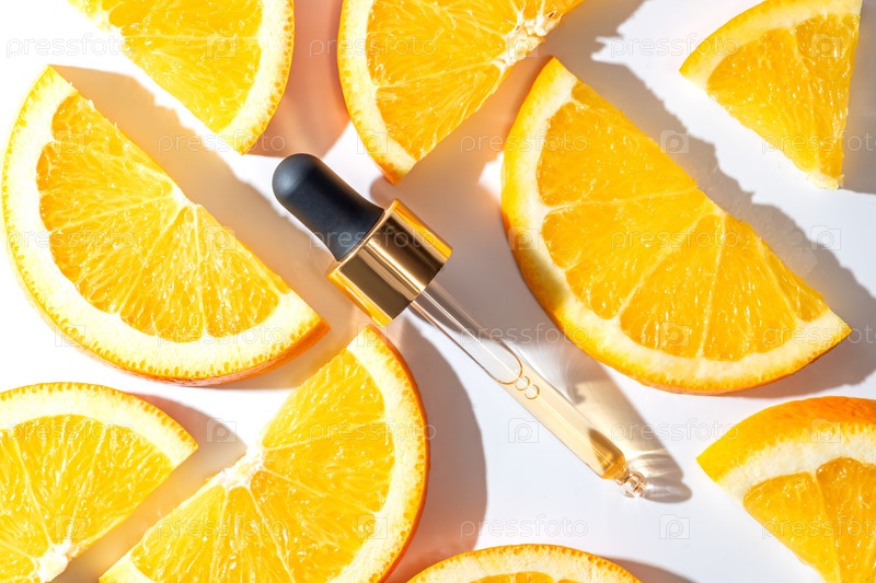 Крупный план пипетки с заливкой жидкой сыворотки с витамином С и тенями на белом фоне. Модная косметика с жесткими тенями
