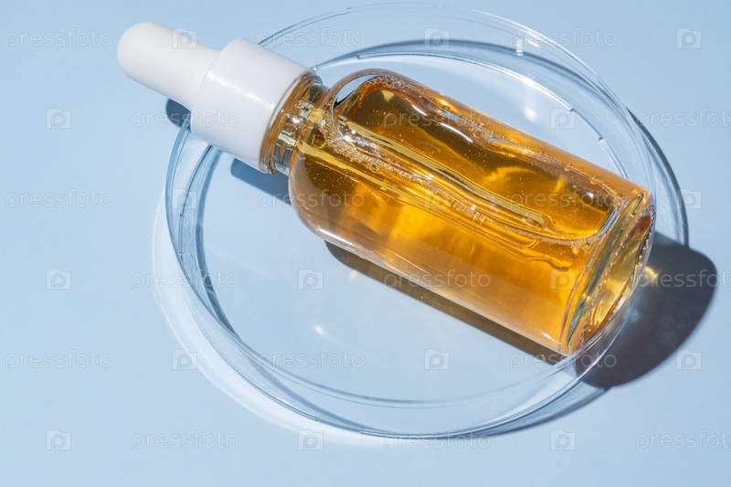 Концепция косметической красоты с бутылочной сывороткой и чашкой Петри на синем фоне, концепция лабораторных косметических исследований