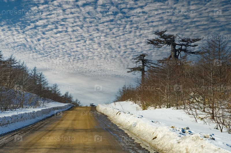 Россия. Дальний Восток, Курильские острова. Вид на весеннюю природу с грунтовой дороги вдоль острова Итуруп