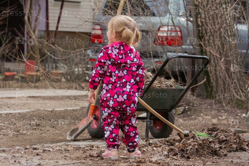 Двухлетняя девочка самостоятельно собирает листья метлой