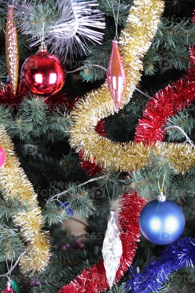 Игрушки на зеленой рождественской ели