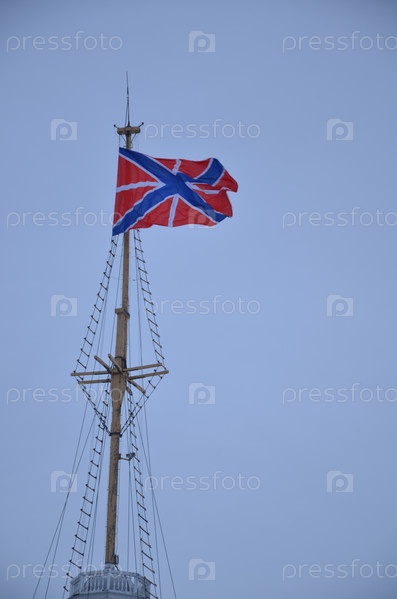 Крепостной флаг гюйс на флагштоке Флажной башни Нарышкина бастиона Петропавловской крепости в Санкт-Петербурге