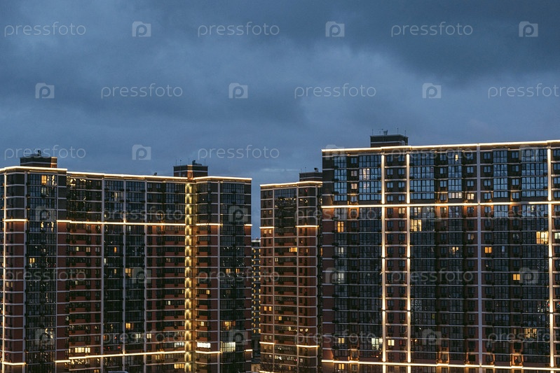 Современный ночной город, вид на высотное здание в свете фонарей ночного мегаполиса