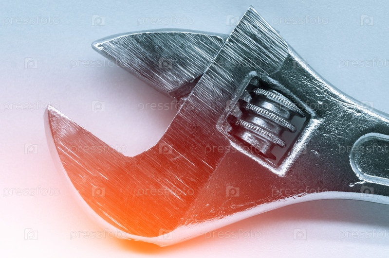 Разводной ключ на белом фоне и с эффектом подсветки в рамке. Крупный план разводного ключа для ремонта. Ручной универсальный инструмент. Селективный фокус