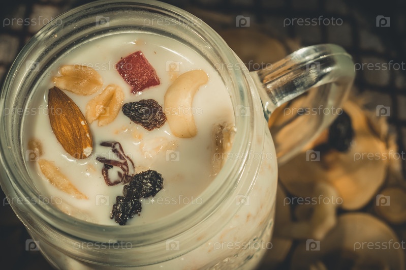 Стеклянная банка со здоровым завтраком из овсянки с орехами, сухофруктами и йогуртом. Рано утром, вид сверху, крупный план