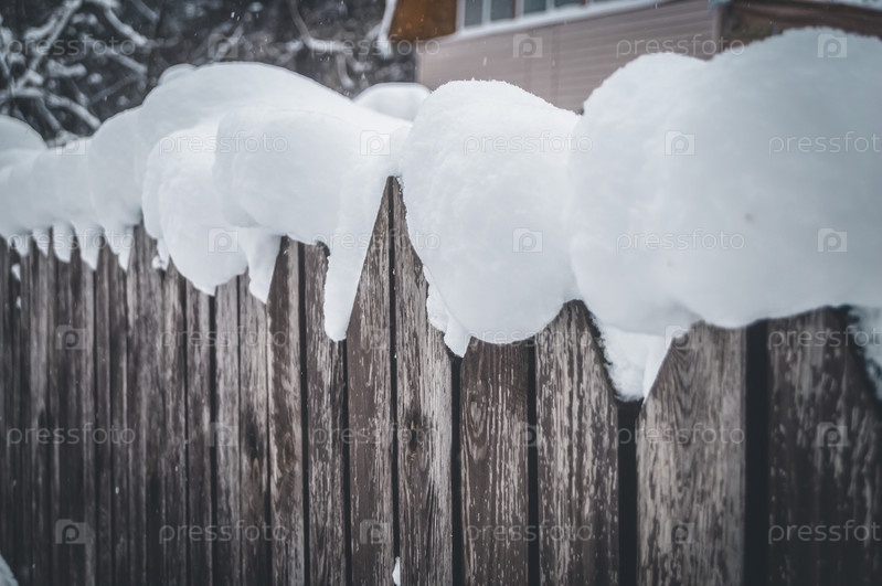 Старый деревянный частокол в деревне зимой. Снег на заборе. Селективный фокус