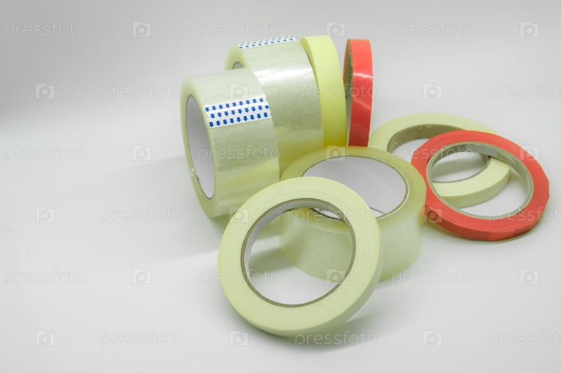 Клейкая лента разных типов и размеров. Прозрачная и цветная малярная лента. Канцелярские и строительные товары. Селективный фокус