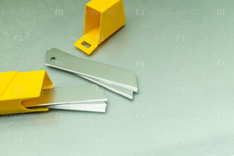 Новые лезвия для канцелярского ножа. Набор запасных канцелярских лезвий. Селективный фокус, пространство для копирования