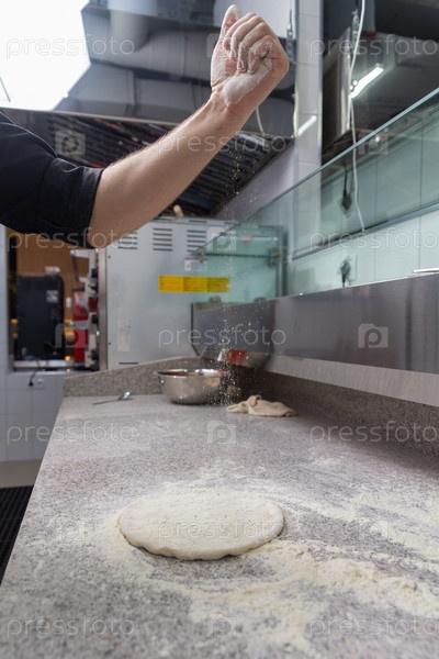 Шеф-повар готовит тесто с мукой. Мужчина посыпает мукой тесто на металлический стол для приготовления пиццы. Вертикальный