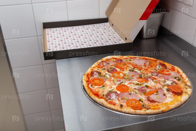 Свежая горячая пицца с колбасой, ветчиной, грибами, перцем, помидорами и моцареллой на столе в пиццерии, готовая к доставке. Итальянская кухня, домашняя выпечка, фаст-фуд, концепция доставки