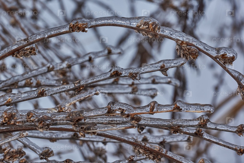 Растения после ледяного дождя. Ветви растений и побеги покрыты льдом. Ледяные ветки растений, последствия ледяного дождя