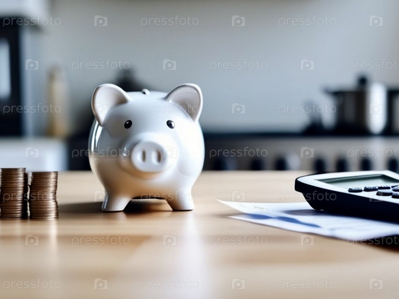 В светлой чистой кухне на столе белая свинка - копилка, рядом с которой калькулятор, счета, квитанции и деньги, минималистский стиль