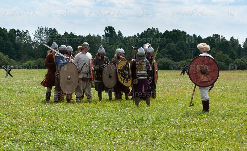 Средневековые воины перед боем. Первый в России Международный фестиваль Военно-исторической реконструкции "Душоновские Маневры 2021 г"