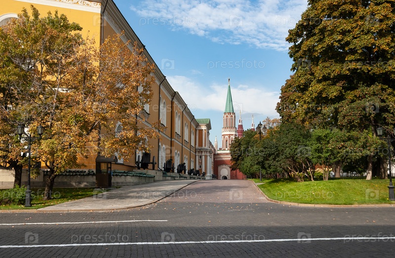 Московский кремль, вид с Сенатской площади на здание Арсенала и Никольскую башню. Москва, Россия