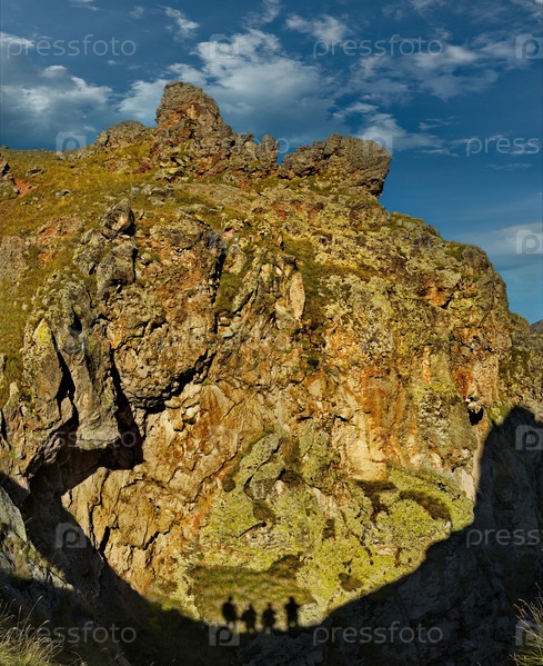 Россия, Приэльбрусье. Контрастная тень на скале в виде четырех туристов покорителей самой высокой горы Кавказа Эльбрус (5642 м)