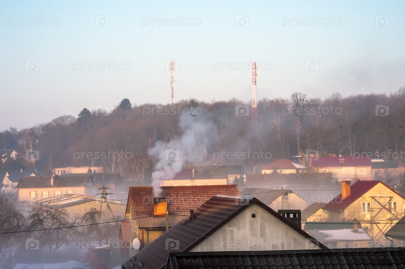 Туман над деревенскими домами. Крыши деревенских домов. Калининградская область, Россия, 22 февраля 2021 г