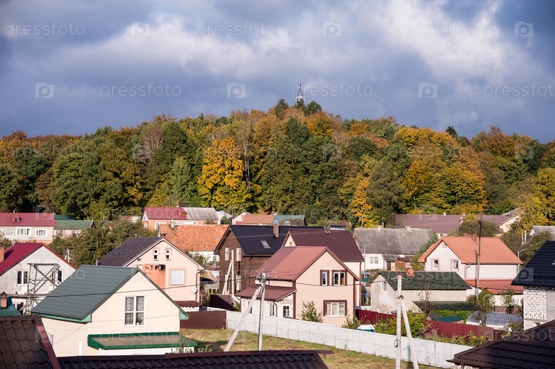 Деревня возле леса. Новые частные дома. Красивый осенний лес и крыши домов. Калининградская область, Россия, 17 октября 2020 г
