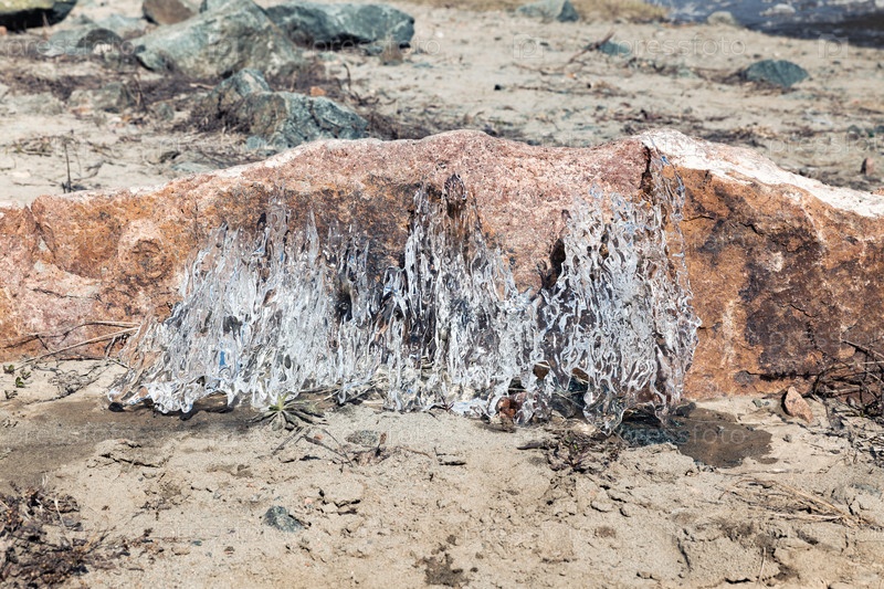 Тающий лед на фоне камней под ярким солнцем