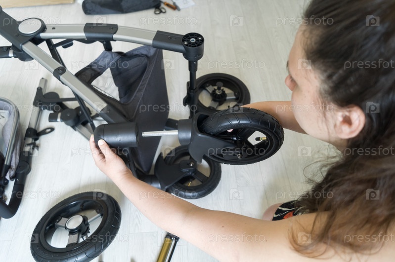 Женщина устанавливает колесо на новую детскую коляску. Процесс ремонта и сборки коляски для новорожденного ребенка. Колесо тележки в сборе. Селективный фокус