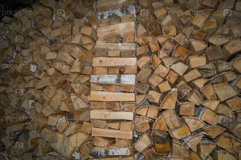 Колотые березовые дрова для обогрева домашней печи и камина зимой. Деревянная стена из кучи дров, сложенных в сарае. Подготовка запаса дров на зимний период. Селективный фокус