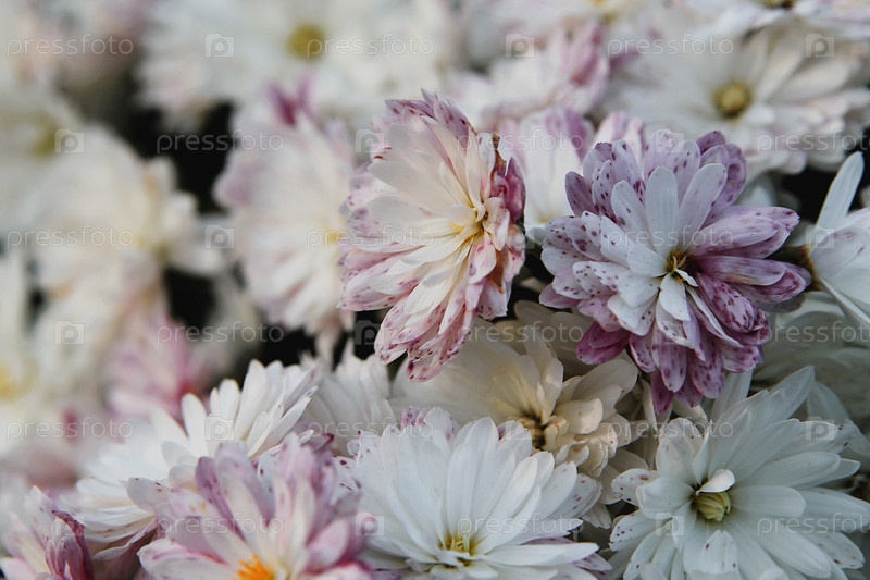 Розовые и белые хризантемы на естественном фоне, фоновое изображение розовых пушистых цветов, цветы в саду