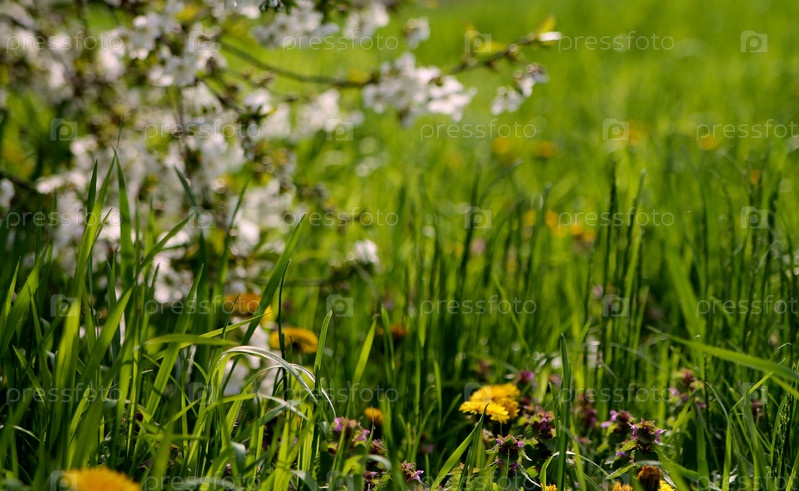 Цветы вишни на размытом фоне. Обои на стене. Нежный весенний фон
