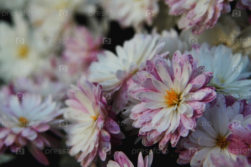 Розовые и белые хризантемы на естественном фоне, фоновое изображение розовых пушистых цветов, цветы в саду
