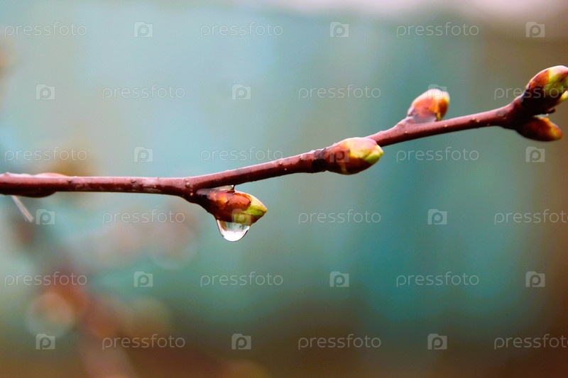 Большие капли дождя на ветвях ранней весной. Почки просыпаются от теплой погоды
