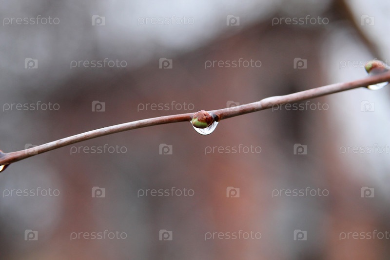 Большие капли дождя на ветвях ранней весной. Почки просыпаются от теплой погоды