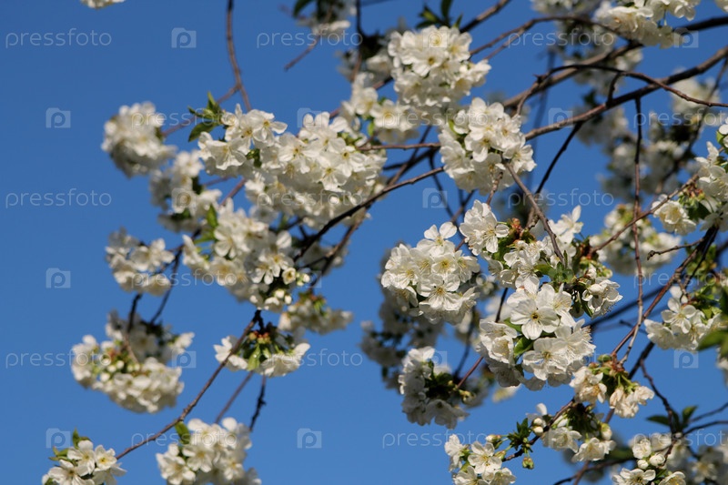 Цветы вишни на размытом фоне. Обои на стене. Нежный весенний фон