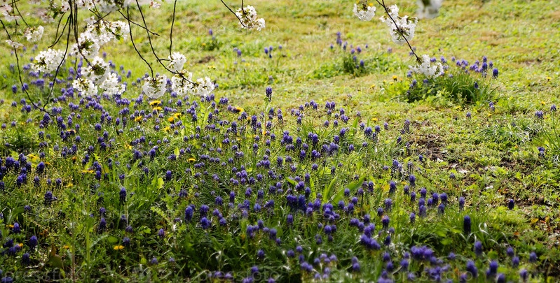 Мускари или виноградный гиацинт. Весенний цветочный фон. Красивый яркий дизайн открыток, календарей, буклетов. Луг полевых цветов на размытом солнечном фоне парка