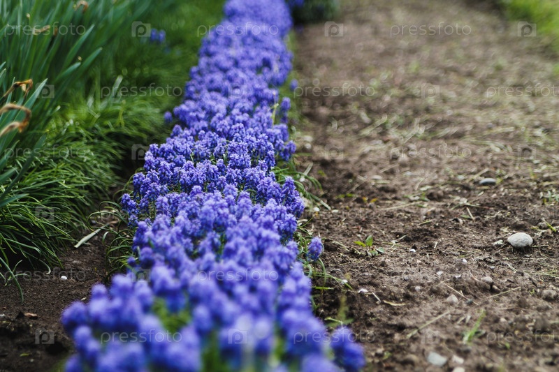 Мускари или виноградный гиацинт. Весенний цветочный фон. Красивый яркий дизайн открыток, календарей, буклетов. Луг полевых цветов на размытом солнечном фоне парка