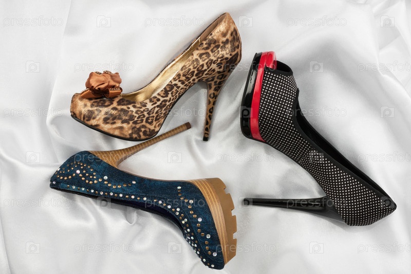 Три роскошные женские ботинки на высоких каблуках, лежащие на белом шелке. Вид сверху. Three luxurious women's shoes with high heels lying on a white silk. View from above