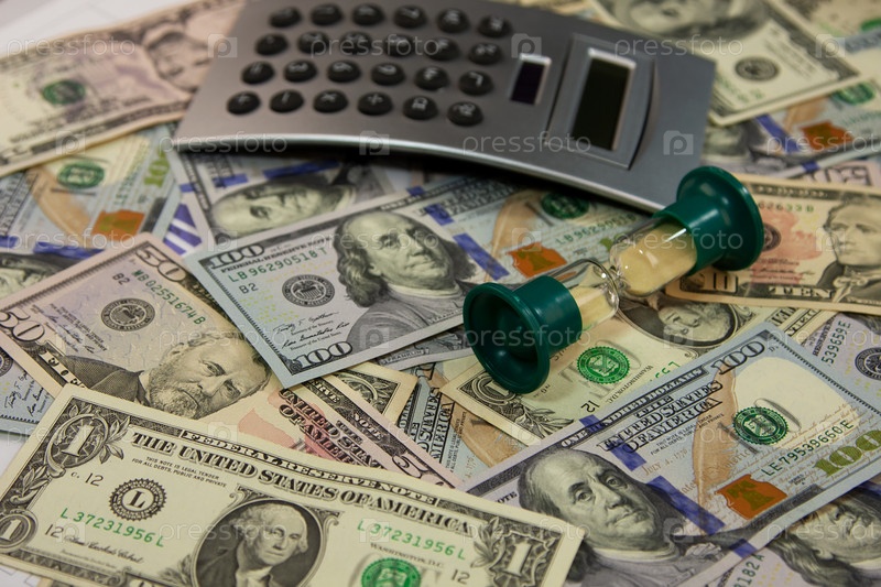 Калькулятор и песочные часы лежат на долларах. Крупный план. Калькулятор и песчаные часы лежат на долларах. Близкий снимок