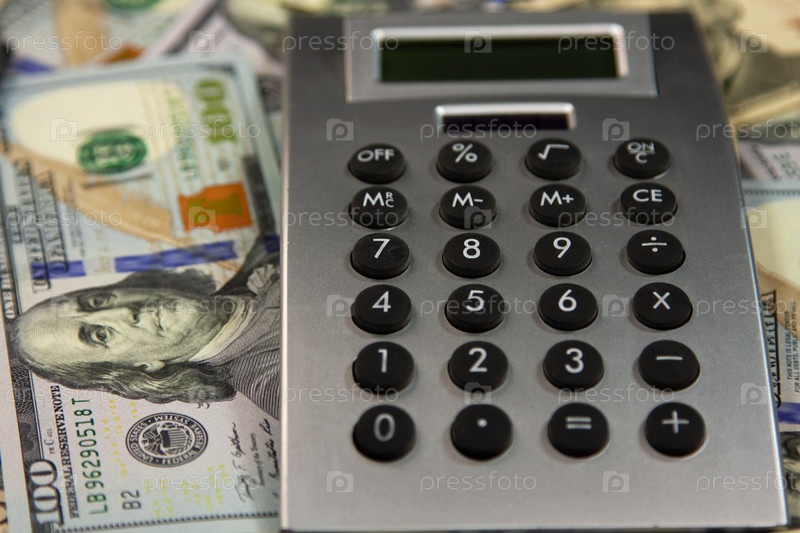 Калькулятор лежит на долларах. Крупный план. Калькулятор лежит на долларах. Близкий снимок