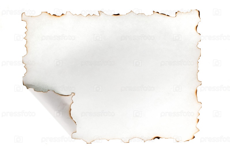 Чистый белый лист бумаги с обгоревшими краями и изогнутым углом. Выделенный на белом фоне. Пустой белый лист бумаги с ожоговыми краями и сложенным углом. Изолированный на белом фоне