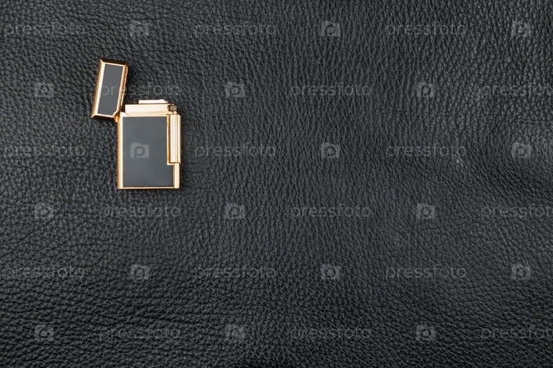 Золотая зажигалка лежит на натуральной коже