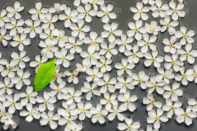 Весенний натюрморт с зеленым листом на белых цветах