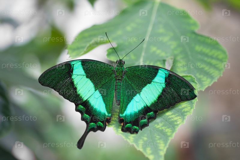 Красивая зеленая бабочка, сидящая на зелёном листе. Крупный план. Прекрасная зеленая бабочка, сидящая на зеленом листе. Близкий снимок