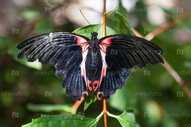 Красивая черно-красная бабочка, сидящая на зеленом листе. Крупный план. Прекрасная чёрно-красная бабочка, сидящая на зелёном листе. Близкий снимок