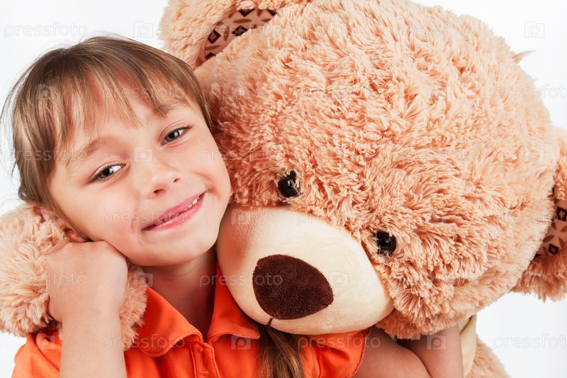 Милая маленькая девочка играет со своим другом большим пушным медведем. Малышка обнимает своего плюшевого мишку. Красивая маленькая девушка играет с ее другом большим меховым медведем. Девчонка обнимает своего Teddy Bear
