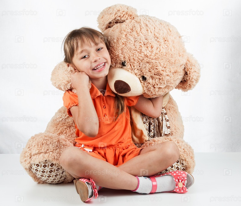 Милая маленькая девочка играет со своим другом большим пушным медведем. Малышка обнимает своего плюшевого мишку. Красивая маленькая девушка играет с ее другом большим меховым медведем. Девчонка обнимает своего Teddy Bear