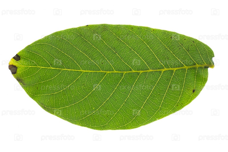 Зелёный лист, выделенный на белом фоне. Вид сверху. Зеленый листок изолированный на белом фоне. Высокий вид