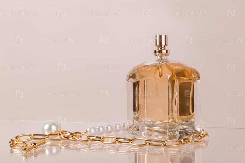 Дорогой аромат женского или мужского парфюма в шикарном флаконе на бежевом фоне с жемчужным ожерельем. Передний план. Копировальное пространство