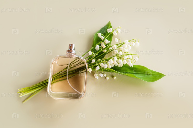 Прозрачный флакон духов с нежным ароматом весенних ландышей лежит на букете цветов. Пастельный фон