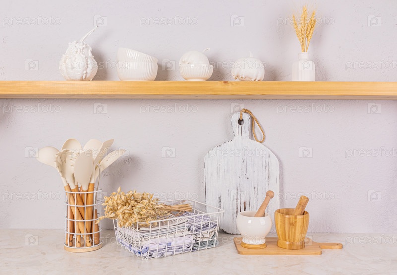 Вид спереди на открытую деревянную полку и кухонную столешницу с экологически чистой кухонной утварью и букетом кукурузных початков. Экологичная кухня